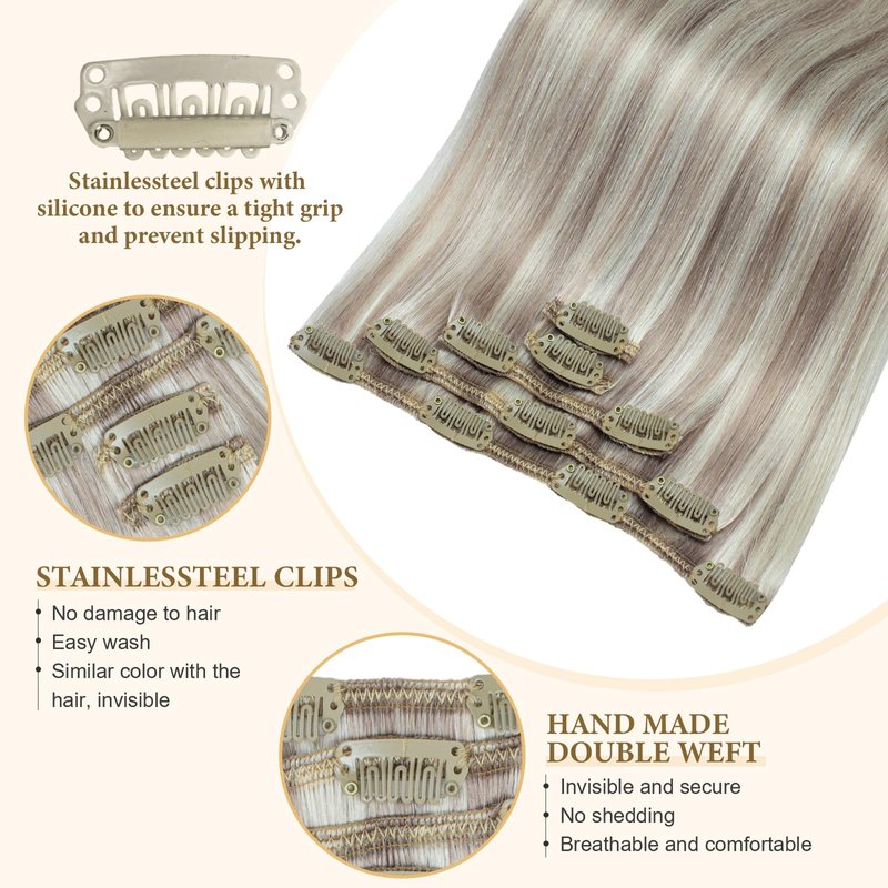 - 【Comfortable & Secure & Quick to Wear】Stainlessteel clips with unique U-shaped design are firm and comfortable to wear. The back has a soft silicone to ensure a tight grip and prevent slipping, no damage to hair and scalp. Clip ins human hair extensions can be worn and took off freely within 5 minutes by yourself to change hairstyle for different occasions.(Wedding, Concerts, Make-up Parties, Dating, Prom and on). Even if it's your first time wearing a hair extension, you can easily handle it.