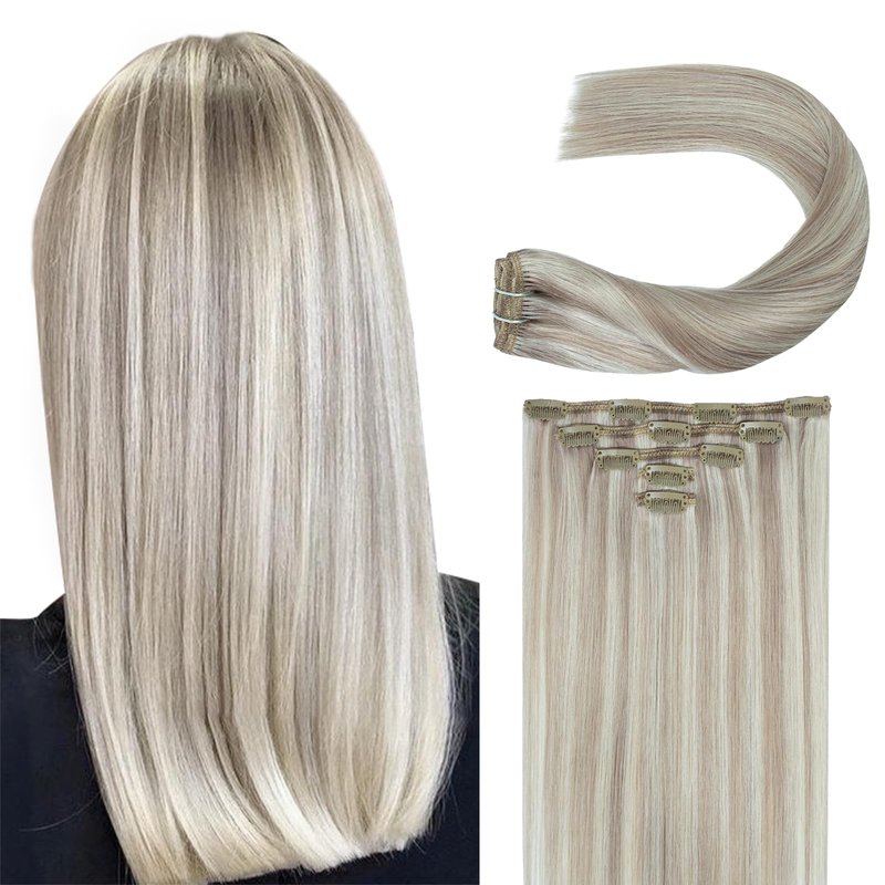 Clip in Human Hair Extensions Ash Blonde Highlighted Platinum Blonde 18 Inch 60G 5 PCS Clip on Hair Extensions Invisible Double Weft Straight Natural Remy Brazilian Clip ins Real Human Hair for Women