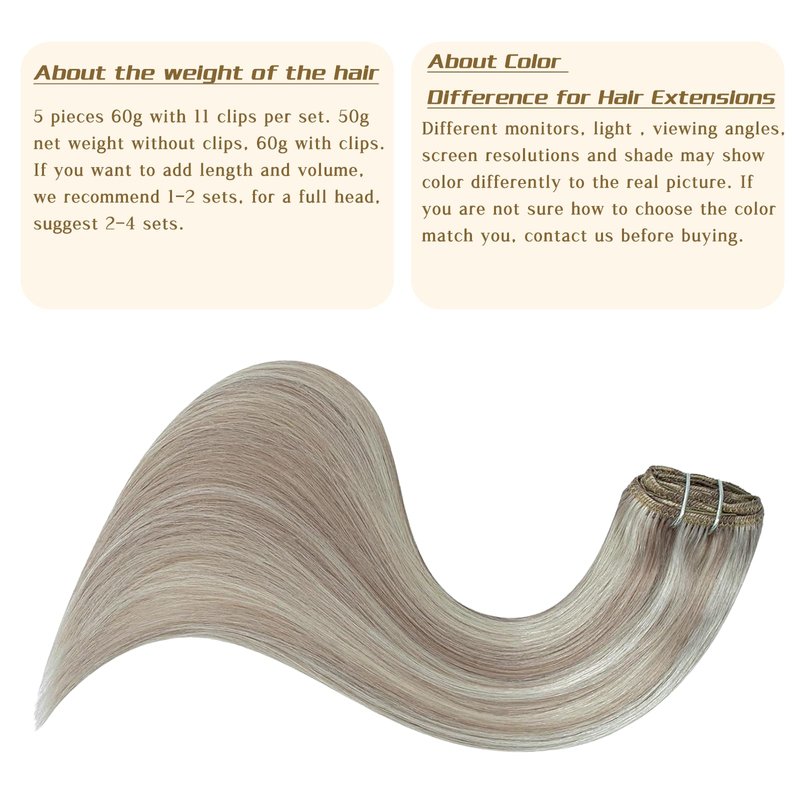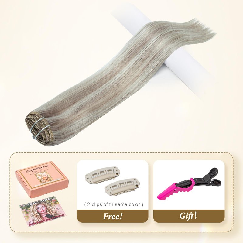 - 【Clip in Hair Extensions Specification】Eyefull Stell exclusive 5 pieces clip on human hair extensions 60g with 11 clips per set, 50g net weight without clips, 60g with clips, can effectively add highlights for people with thick hair without weighing down your hair too much. If you want to increase the length and the thickness, please buy more packs. We recommend buying 2-4 packs for a natural & full look. Also, we offer 2 replacement clips and an alligator clip.