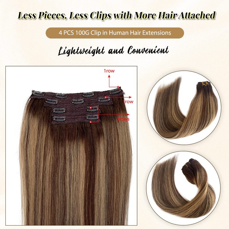 Clip in Human Hair Extensions Blonde Balayage Clip in Real Remy Hair Extensions Double Weft 100grams 4pcs Thick Straight Medium Brown with Caramel Blonde Highlights Extensions for Women 16 Inch
