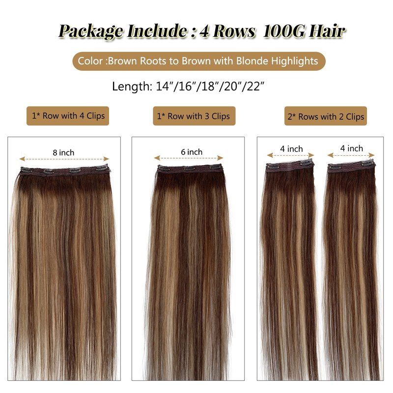 - Specifications: solid colors/blonde highlights/brown balayage/ombre hair extensions clip in human hair, we provide many color options for you and more will be added in the future; 14”/16”/18”/20”/22”; there are 4 rows of the pack, 1 row with 4 clips, 1 row of 3 clips and 2 rows of 2 clips; each pack weighs 100grams; Blend Flawlessly In So Well Into Your Natural Hairstyle and Color