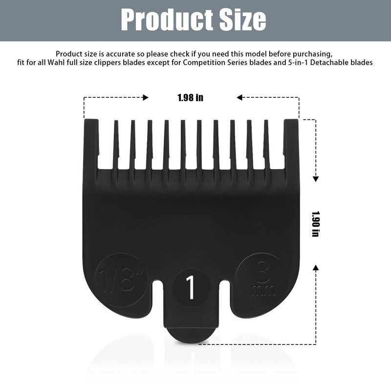 - [Guard Features] Clipper guards comb #1-3114-001 is black in color and provides a 1/8" (3.0mm) length. Fits for Wahl full size clippers blades except for competition series blades and 5-in-1 detachable blades.