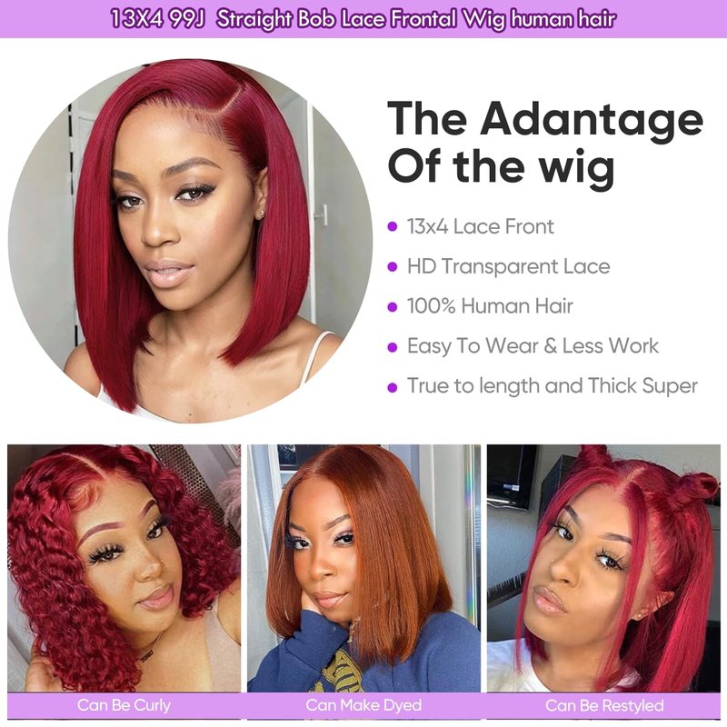 - Burgundy Lace Front Wigs Human Hair Material: Wine Red Color 99j Bob Wig Human Hair, Brazilian Virgin Remy Human Hair, 150% Density Human Hair Lace Front Wigs.
