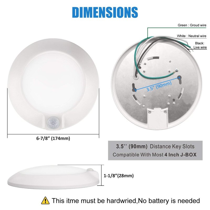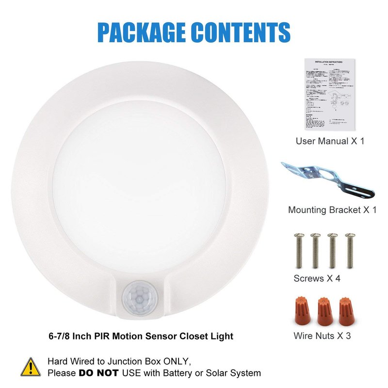 - No Battery Needed- This closet motion sensor ceiling light must be hardwired to a standard 4 in junction box, no battery need. Do not work with solar system.