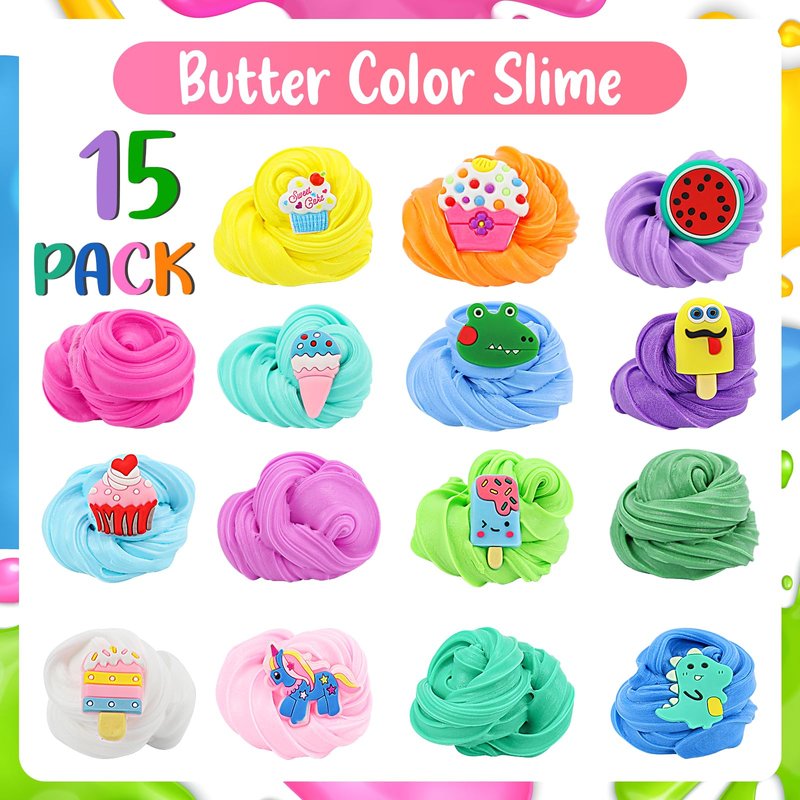 - 💕【15 PCS Butter Slime Toy Kit for Kids】This slime consists of 15 PCS 60 ml butter slime, 15 cute decorative gadgets in different shapes, 1 bag of foam balls, 1 bag of sugar granules and 2 ice cream molds, 2 cake molds. The contents are rich and lovely, can fully meet the DIY needs of kid.