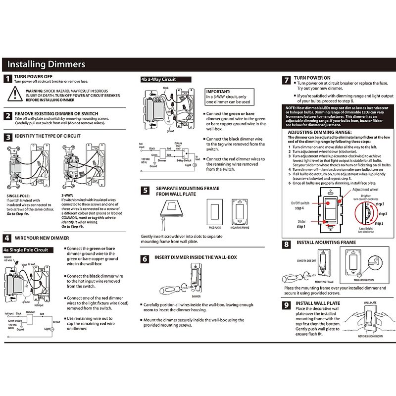 Single pole/3-way 120-volt LED-compatible dimmer switch. It is a decorative slide dimmer light switch with an independent On/Off switch and 600-watt capacity. This dimmer switch features a trim dial beneath the cover plate, which allows for sensitivity adjustment during installation to achieve compatibility with LED lamps. Easily turn your lights on and off using the rocker switch and automatically return to your previously selected light level of brightness.