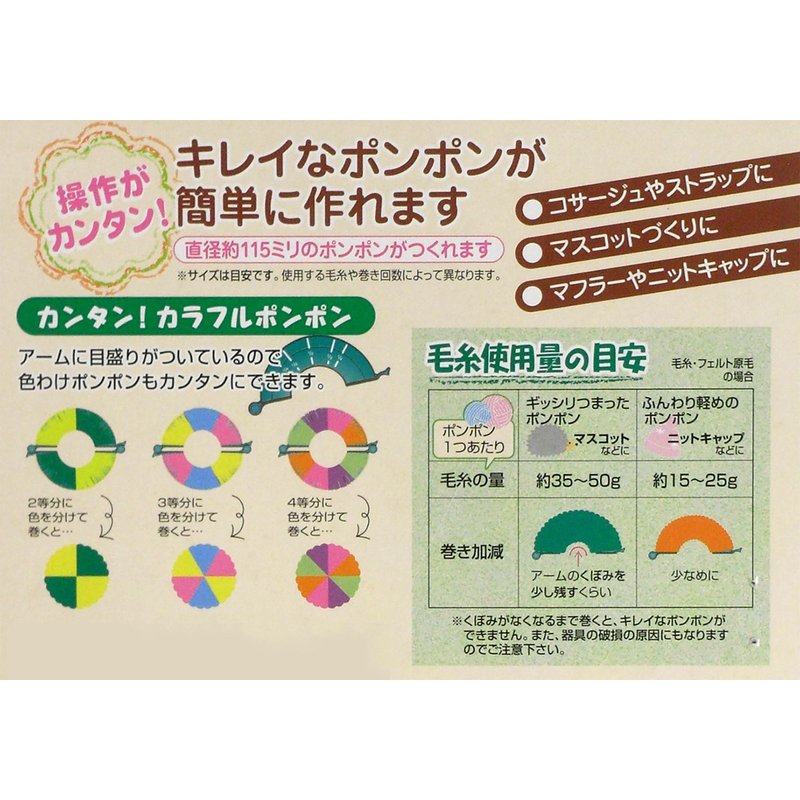 ? Manufacturer Clover ? Product name Super Pompon Maker Jumbo Integral type in which parts can not be removed during making. You can easily clean beautiful pompon. You can make ponpons with felt and woolen threads and use it to make mascots and accessories. You can easily make a point of a muffler (at the end of a hat) P Size Size Size about 115 mm in diameter can be made easily. Cell phone strap and key chain, perfect for making mascot size! It is! - This item will be in Stock Now, it will take 5-7 business days for the item to be ordered.