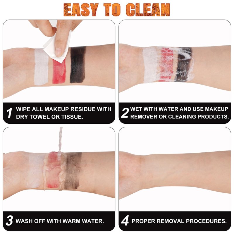 - Long Last And Easy To Clean: This black white red face body paint which can cover your original skin color very well, no fall off and fade up to 24H, smooth and non-greasy. It can be easily washed off the skin with warm soapy water, sometime need to use makeup remover.