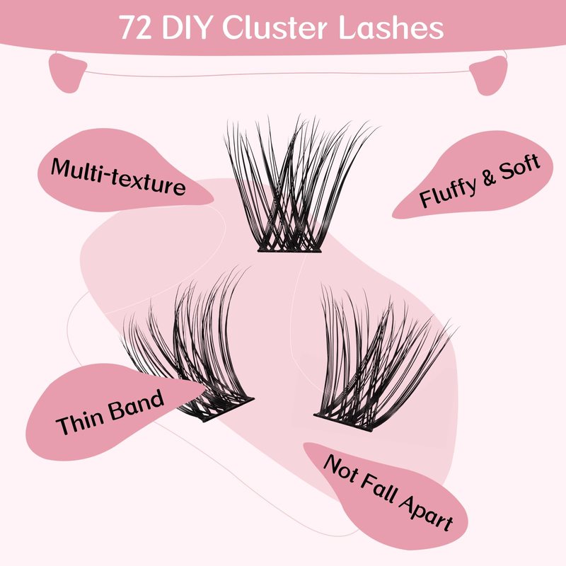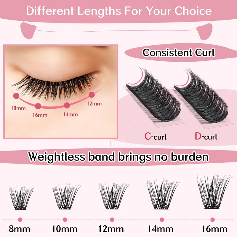- Bring salon to your home: Pro LashBeauty Lash clusters are easy to apply. Divided individual Lashes into sections, easy to pick up and apply by yourself. You can apply the eyelashes with different lengths and styles according to different occasion. You will become a master of DIY lash extensions with a little practice!