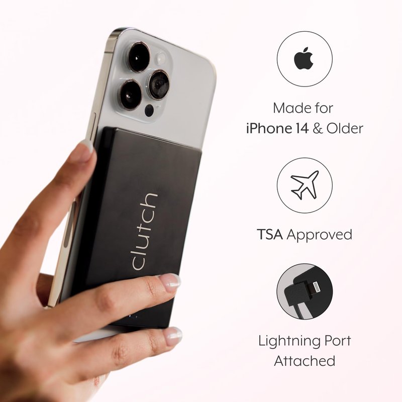 Clutch - Pro Portable Charger - Compatible with iPhone 14 or Older & Small Devices - Power Bank - Magnetic Battery - TSA Approved Travel Charger - USB Rechargeable - Built-in Cable - 3.7oz - Black