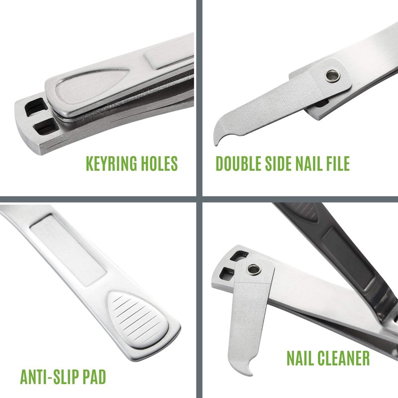 - SUPERIOR NAIL CUTTER FILE/CLEANER & KEYCHAIN HOLES -- double sided swing out nail file (2 grades of roughness) so you can file your whole nail effectively. And the handy nail cleaner will clean under your nails quickly and easily!