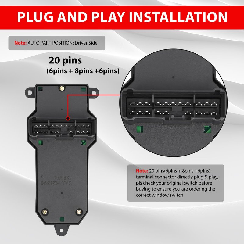 - 【20 PINS】20 pins(6pins + 8pins +6pins) terminal connector for plug and play style. Just need to remove the Driver side power window switch and replace it, easy to install. NOTE: Without an exact match of buttons and pins, it will be incompatible with your vehicle, check your original switch to make sure you ordered the correct one