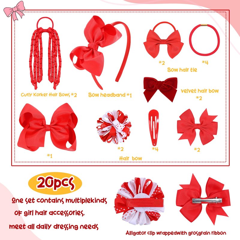 Get rid of the difficulty of choice and bring them all home at once!!! The red hair bows for girls designed to accommodate different hair types and styles. This red ribbon for hair is suitable for thick, thin, curly, or braided hair. perfect for both casual and formal occasions. These 20pcs red bows set have 6inch hair bow(1pcs),bow headband(1pcs),3.5inch toddler clips(1pair), 2inch velvet hair bows(1pair), 2inch round bows for girls(1pair), 3inch mini bows hair tie(1pair),8inch long curly bows with tie(1pair),elastic hair ties(4pcs),2inch hair barrettes(4pcs).