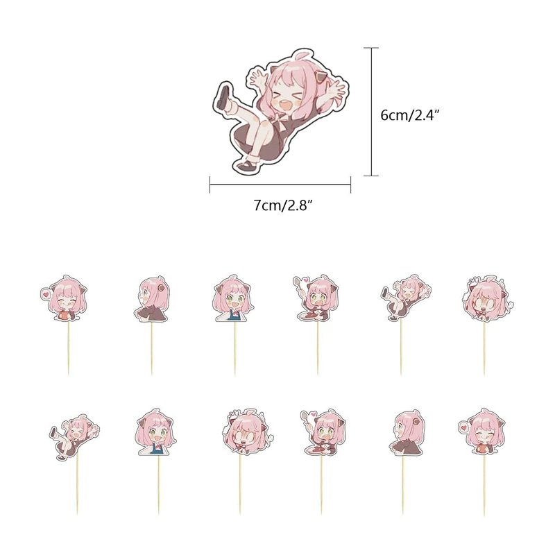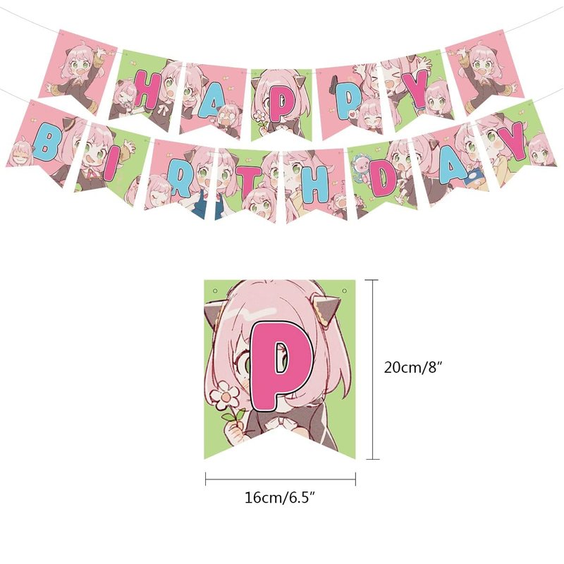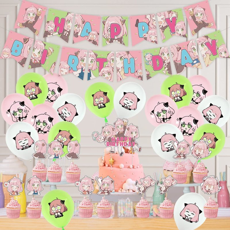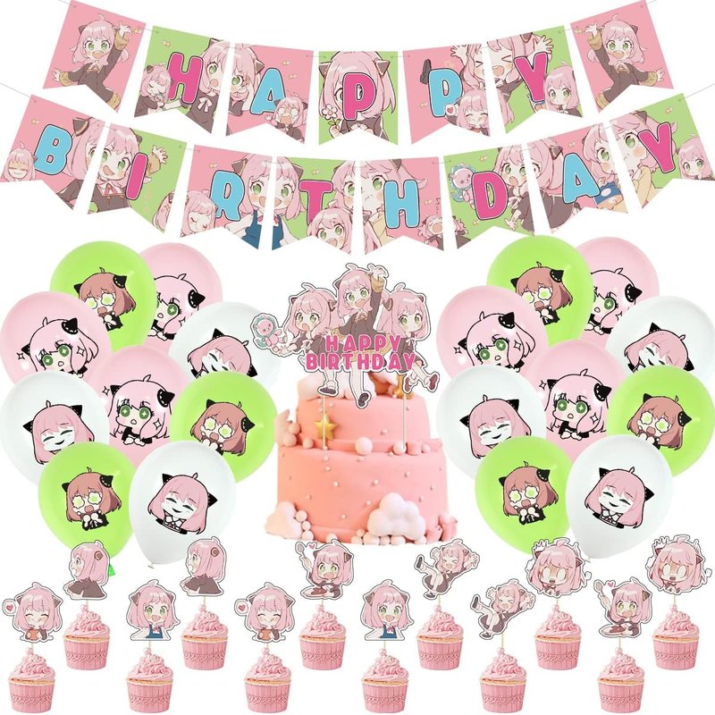 - Anya Supplies Includes - 1pcs happy birthday banner,12pcs cake toppers,1pcs big happy birthday cake topper,18pcs colorful balloons.You can organize a wonderful themed birthday party for your loved ones!