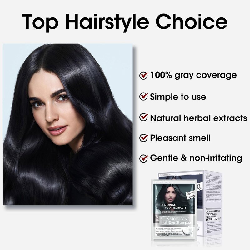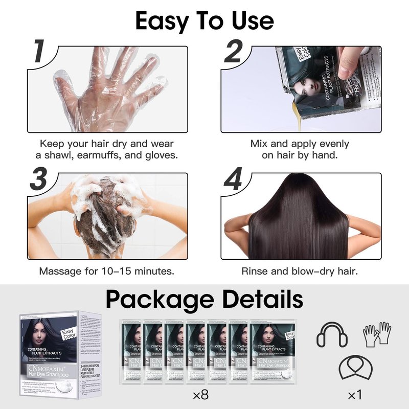 Introducing our revolutionary 3-in-1 Hair Color Solution, designed to simplify your hair coloring routine while delivering salon-quality results at home. Our shampoo offers complete gray hair coverage, ensuring every strand is rejuvenated with vibrant, long-lasting color. Formulated with natural ingredients like polygonum multiflorum and ginseng extract, gallnut extract, arborvitae tops extract, polygonum multiflorum extract, it colors your hair and strengthens roots, leaving your locks feeling strong, soft, and shiny. With our color-safe formula, you can trust that your hair's health is in good hands. Whether you're looking to cover gray hair or enhance your natural shade, our shampoo provides a hassle-free solution suitable for all hair types. Plus, it's gentle enough for use on facial hair, making it the perfect beard dye for a seamless grooming experience. Experience the convenience of our 3-in-1 Hair Color Solution, combining the functions of a tint, shampoo, and conditioner in one pack. Say goodbye to complicated hair coloring processes and expensive salon visits – with our shampoo, achieving salon-quality results has never been easier. Customer satisfaction is our top priority, which is why we offer a dedicated customer service team ready to assist you with any concerns or inquiries. Rest assured that when you choose our product, you're choosing a reliable and effective hair color solution that delivers exceptional results every time. 8 packs in a box, 28ml each, Instant Coloring Gift for Mom Dad. Important Reminder: Use Gloves When Applying Hair Dye Shampoo Attention: When using hair dye shampoo, always remember to wear gloves to prevent staining your skin and nails. If you forget to wear gloves, make sure to rinse your hands thoroughly with water immediately after application to avoid any unwanted dye stains. Note: The natural oils on your scalp generally protect it from staining, but your hands and nails are more susceptible to dye absorption. Stay safe and stain-free!