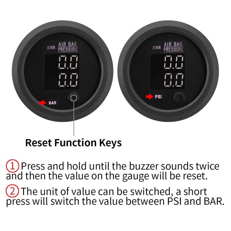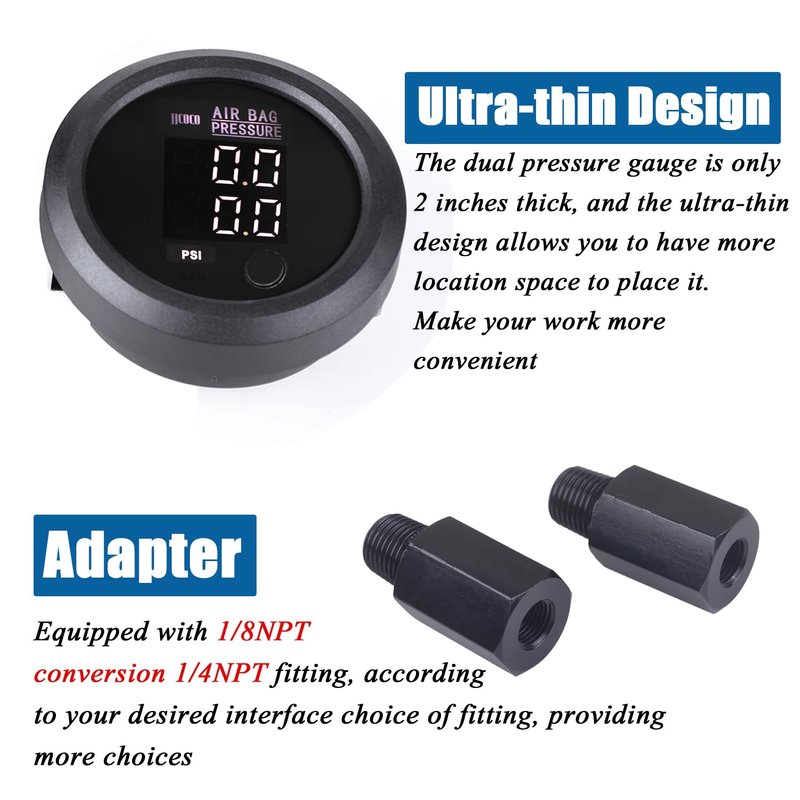 --Practical: The dual display design allows for simultaneous monitoring of two different pressure points, which greatly improves work efficiency and is especially suited for applications that require a quick comparison of different suspension airbag pressures during the adjustment process.