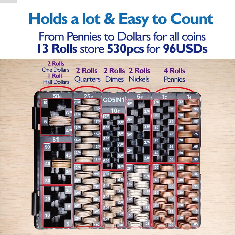 - 3. Holds a lot & Easy to Count: CO5IN1 Change Counting Tray includes 4 Rolls for Pennies, 2 Rolls for Nickels, 2 Rolls for Dimes, 2 Rolls for Quarters, 2 Rolls for One Dollars and 1 Roll for Half Dollars. Totally 13 Rolls store 530pcs coin for 96USDs.