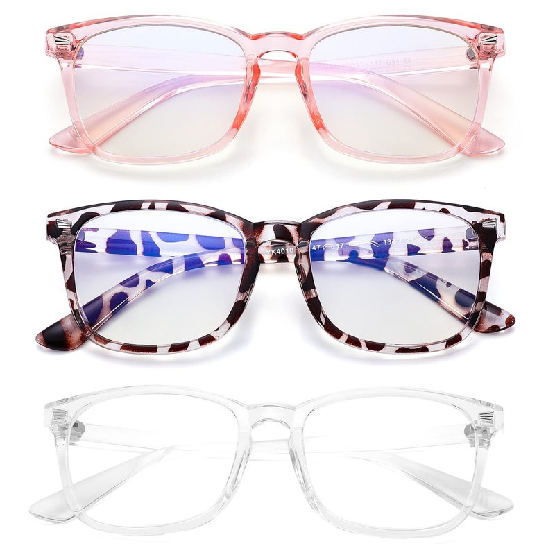 COASION Blue Screen Glasses for Kids Age 3-12, 3 Pack Blue Light Blocking Glasses for Girls Boys, Computer Gaming Fake Eyeglasses (Leopard + Clear Pink + Transparent)