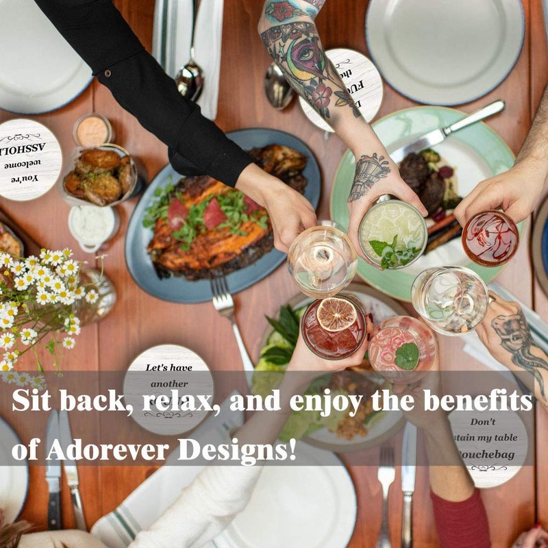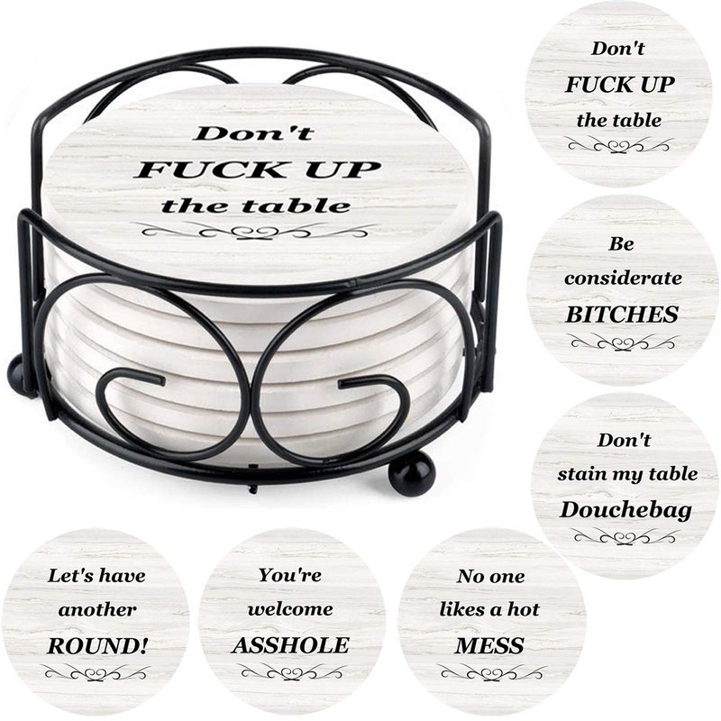 - Novelty Coasters For Drinks: Witty conversation starters! Put smile on everyone's face, these funny absorbent coasters will hilariously remind people to keep their drinks off the table and protect your furniture. You will get six different sayings with this coasters set to match the personalities of each of your guests.