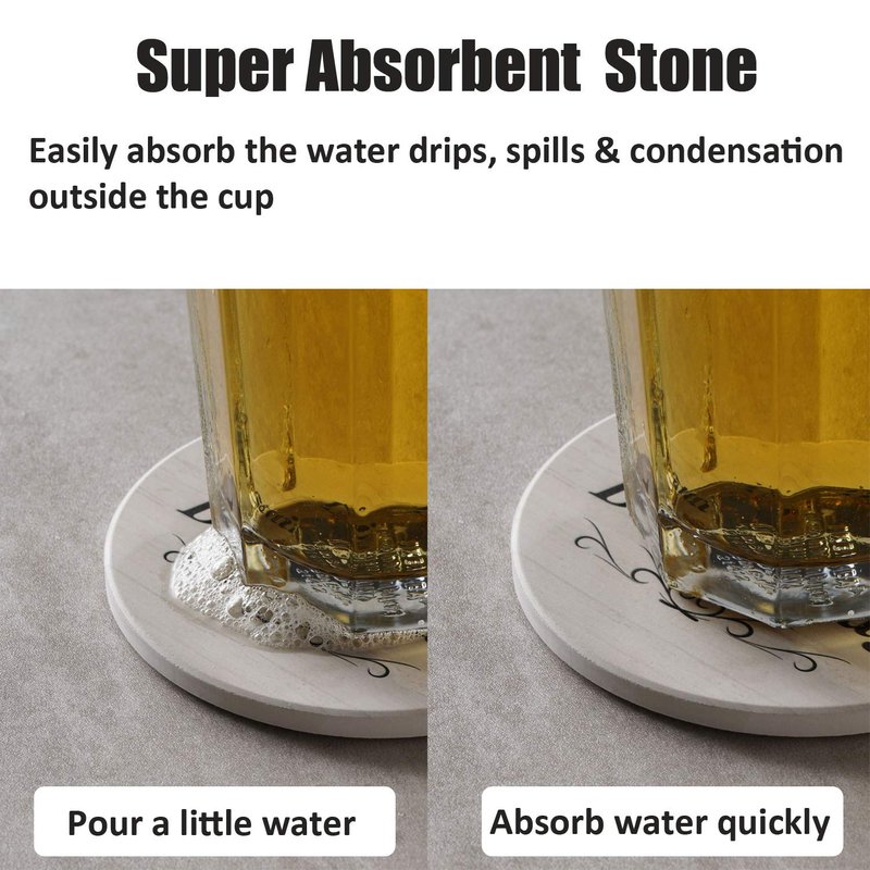 - Absorbent Ceramic Drink Coasters: Our drink coasters are made from a super absorbent ceramic stone that can easily absorb the water drips, spills & condensation outside the cup, When the hot or cold water/drinks/milk liquids spill from mugs/cups, the coaster will absorb all the moisture from your cup, and it absorbs water rings on both sides to keep your furniture dry and clean.