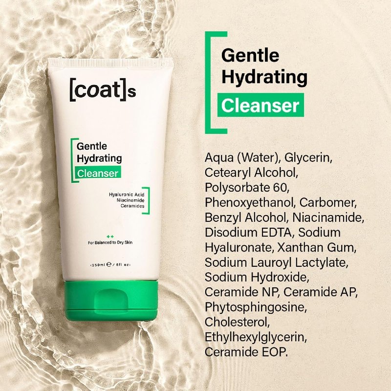 DERMATOLOGIST APPROVED SKINCARE. Clinically proven, skin-barrier protecting, break-out preventing skincare. Developed by expert chemists. Approved by Dermatologists. Trialled by you. Coats Gentle Hydrating Face Cleanser [PROtect] - SKIN HYDRATION: Hydration Boosters: Hyaluronic Acid + Ceramides + Glycerin [PREvent] - BREAKOUTS: Blend of Niacinamide + gentle surfactants HOW TO USE: Simply splash your face with warm water and massage the non foaming facial cleanser gently into your skin. Use light circular motions when using as a makeup remover cleanser. Rinse the face wash off with lukewarm water. Coats skin cleanser is gentle enough for use morning and night. For best results, follow with the next 2 steps of this skincare set Coats Skincare Set: Step 1 Gentle Hydrating Facial Cleanser Step 2 Hydrating Face Toner Step 3 Triple Moisture Water Face Cream All designed to keep your skin healthy now and in the future