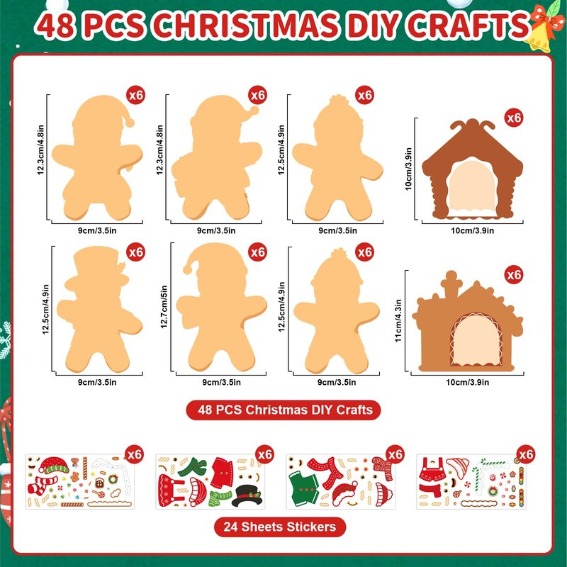 - 【What You Get?】For each Christmas craft kits, you will get 36pcs Christmas gingerbread man cards ( in 6 styles ) , 12Pcs Christmas gingerbread house cards ( in 2 styles ), and 24 sticker sheets to let your kids create their own Christmas decorations.