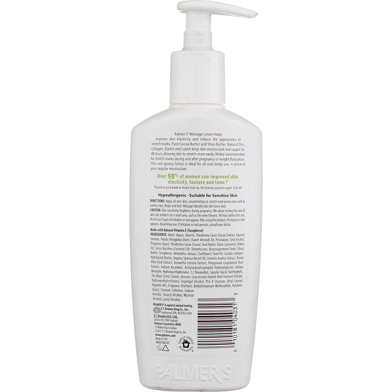 Product DescriptionPalmer's Cocoa Butter Formula Massage Lotion helps visibly improve skin elasticity and reduce the appearance of stretch marks. Pure Cocoa Butter and Shea Butter, Natural Oils, Collagen, Elastin, and Lutein keep skin moisturized and supple for 48 hours allowing skin to stretch more easily. Widely recommened for stretch marks during and after pregnancy or weight fluctuation. This non-greasy lotion is ideal for all over body use, in place of your regular moisturizer.Over 98% of women saw improved skin elasticity, texture and toneMineral Oil Free Paraben Free Phthalate Free Dermatologist ApprovedIngredientsWater (Aqua), Theobroma Cacao (Cocoa) Extract, Glycerin, Glyceryl Stearate, Petrolatum, Propylene Glycol, Mineral Oil (Paraffinum Liquidum), Theobroma Cacao (Cocoa) Seed Butter, Cocos Nucifera (Coconut) Oil, Elaeis Guineensis (Palm) Oil, Cetyl Alcohol, Dimethicone, Butyrosperum Parkii (Shea) Butter, Prunus Amygdalus Dulcis (Sweet Almond) Oil, Tocopheryl Acetate, Centella Asiatical Extract, Hydrolyzed Collagen, Hydrolyzed Elastin, Argania Spinosa Kernel Oil, Acetylaringyltryptophyl Dipheylglycine, Carthamus Tinctorius (Safflower) Seed Oil, Hydroxyethylcellulose, PEG-8 Stearate, Phenoxyethanol, Benzoic Acid, Sorbid Acid, Behentrimonium Menthosulfate, Butylene Gycol, Caramel, Fragrance (Parfum), Benzyl Benzoate, Benzyl Cinnamate, Benzyl Salicylate Limonene, Hexyl Cinnamic Aldehyde, Hydroxycitronellal, Butylphenyl Methylpropinal, Linalool.AllergensHypoallergenic.Suggested UseHelps reduce appearance of stretch marks.WarningsSafety Warning: Skin sensitivity heightens during pregnancy. We advise testing this and all skin care products on a small area, such as the inner forearm, 48 hours before first use. Do not use if signs of irritation or rash appear After using the product, if irritation or rash appears discontinue use. If irritation or rash persists, consult your doctor.