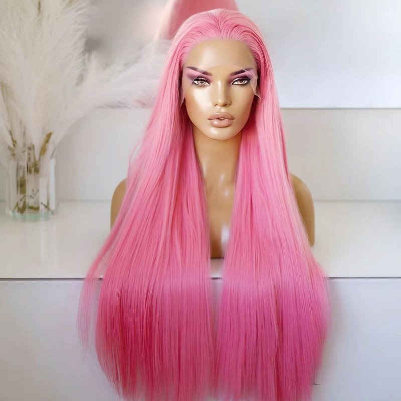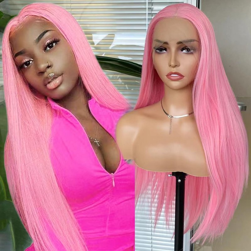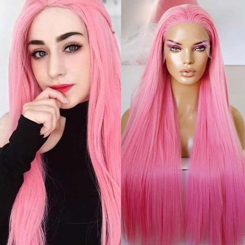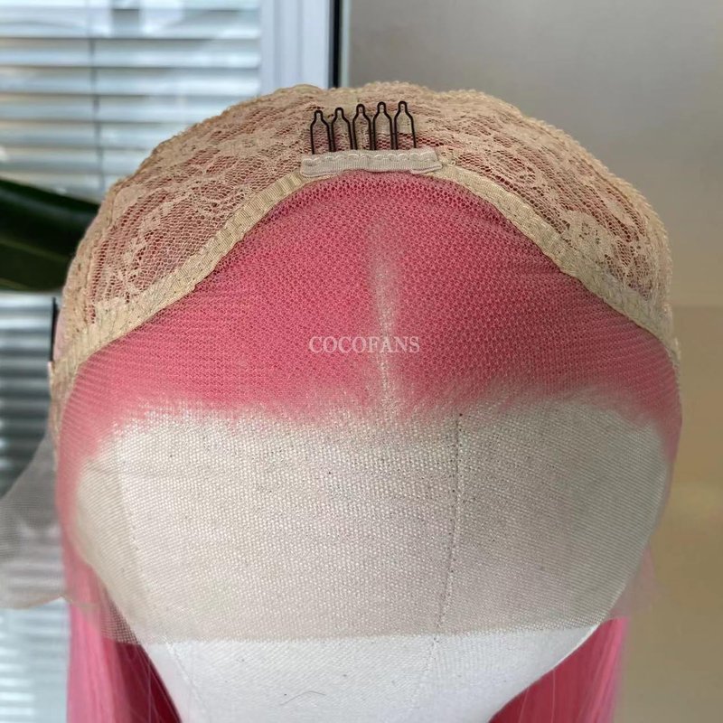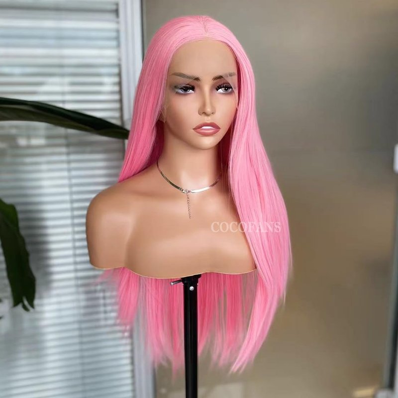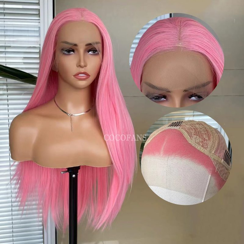 COCOFANS Pink Lace Front Wigs for Women Girls Long Silky Straight Synthetic Lace Wig Glueless Natural Hairline Wig Middle Part Heat Resitant Fiber Hair