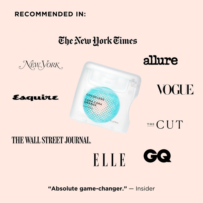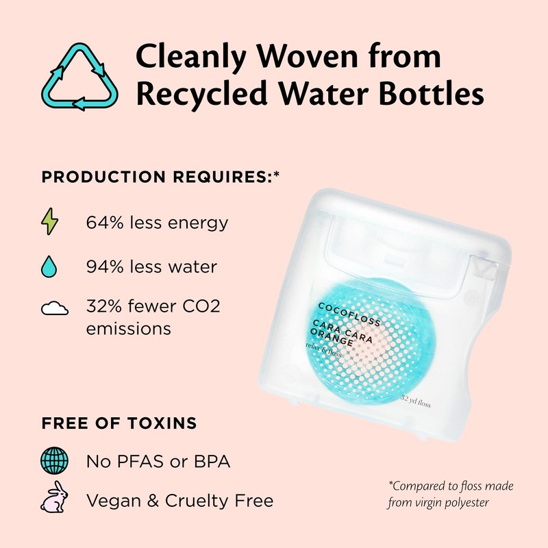 Reveal your most radiant smile with Cocofloss! DENTIST-DESIGNED Dr. Chrystle Cu designed Cocofloss with a unique, textured weave of 500+ threads that work like a net to grab stinky, cavity-causing plaque. The result? A fresh mouth and sparkling clean smile. 6-MONTH SUPPLY OF FLOSS Each 33-yard spool of refreshing Cara Cara Orange Cocofloss provides a daily flosser with about 2 months’ worth of scrubby action and smile bliss. Set includes 3 spools. LIKE A SPA FOR YOUR SMILE Unwaxed floss hurts! Cocofloss soothes sensitive gums with coconut oil, makes flossing comfy with vegan wax, and refreshes your breath. Our lightly fragranced (not flavored) floss turns a daily chore into a treat. Fun for kids too! BETTER FOR THE PLANET Our recycled polyester string floss is spun from ~85% recycled water bottles. Dispenser is endlessly refillable. CLEAN & VEGAN No PFAS, BPAs, or parabens. Leaping Bunny–certified cruelty-free and proud Wildlife Conservation Network partner. WOMEN-OWNED Sisters Chrystle and Cat Cu — a dentist and a former floss-hater — co-founded Cocofloss to create oral-care solutions that are super-cleansing and fun. WORKS BEST WITH THE COCOBRUSH Deep clean between your teeth with Cocofloss, then follow up with the Cocobrush, our ultra-soft toothbrush, and your favorite toothpaste for a totally sparkling smile. (Don’t forget to brush your tongue too for even fresher results!) MORE TREATS FOR TEETH Try our travel-sized packs of Cocofloss Minis; CocoPlush Threaders for implants, bridges, and braces; and other irresistible Cocofloss scents, including Delicious Mint, Pure Strawberry, and Fresh Coconut.