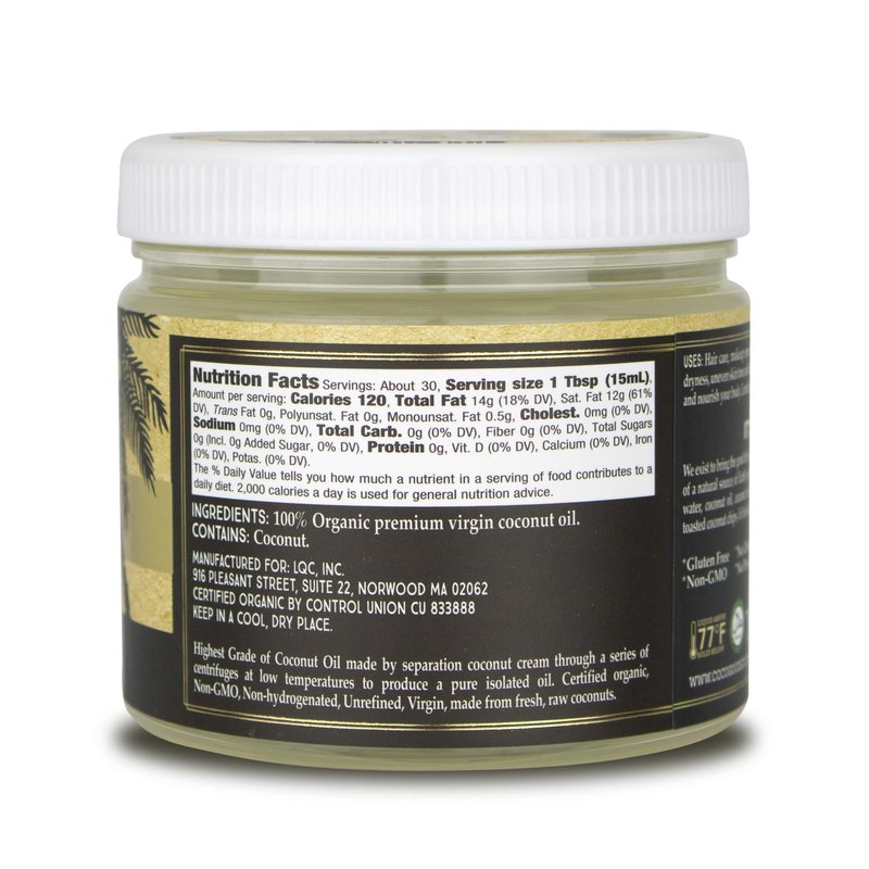 - Certified organic, Non-GMO, Non-hydrogenated, Unrefined, Virgin, made from fresh, raw coconuts.
