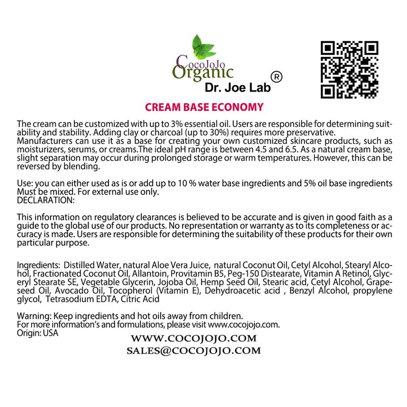 cocojojo CREAM BASE ECONOMY - RICH BASE CREAM FOR COSMETICS, MADE WITH VITAMINS AND COSMETIC GRADE OILS, 100% VEGAN, GENTLE AND HYDRATING - 2 LB