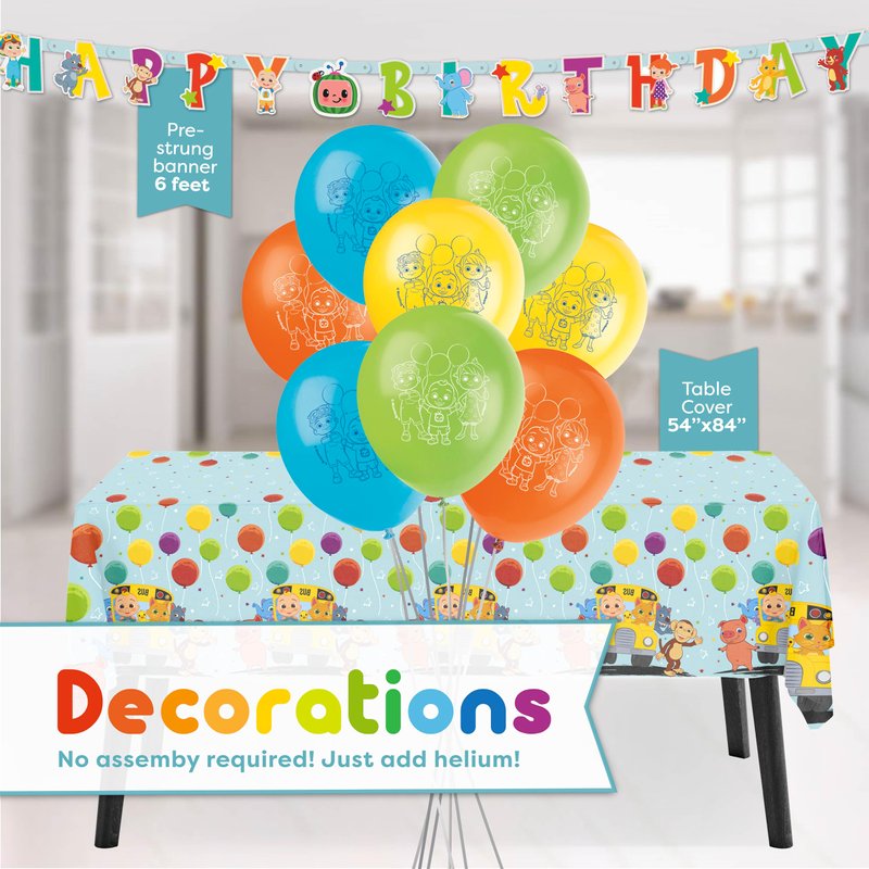 - Decorations -- The hanging banner is the perfect way to add a visual pop to your child's party. Latex Cocomelon balloons can be blown up by breath or helium, in order to float. The leakproof CoCo Melon tablecloth measures 54" x 84", and should fit most six person dining tables comfortably.