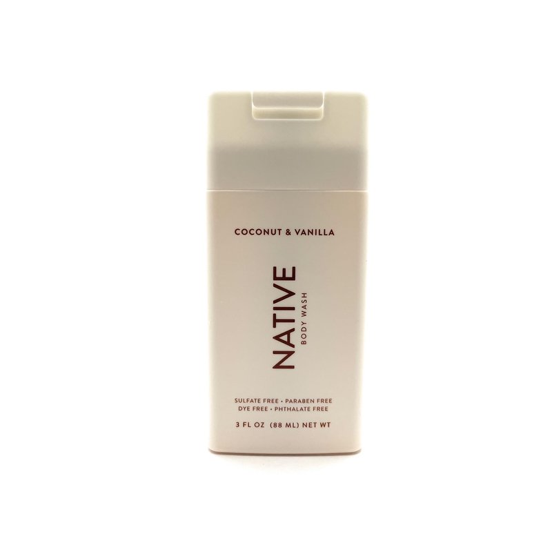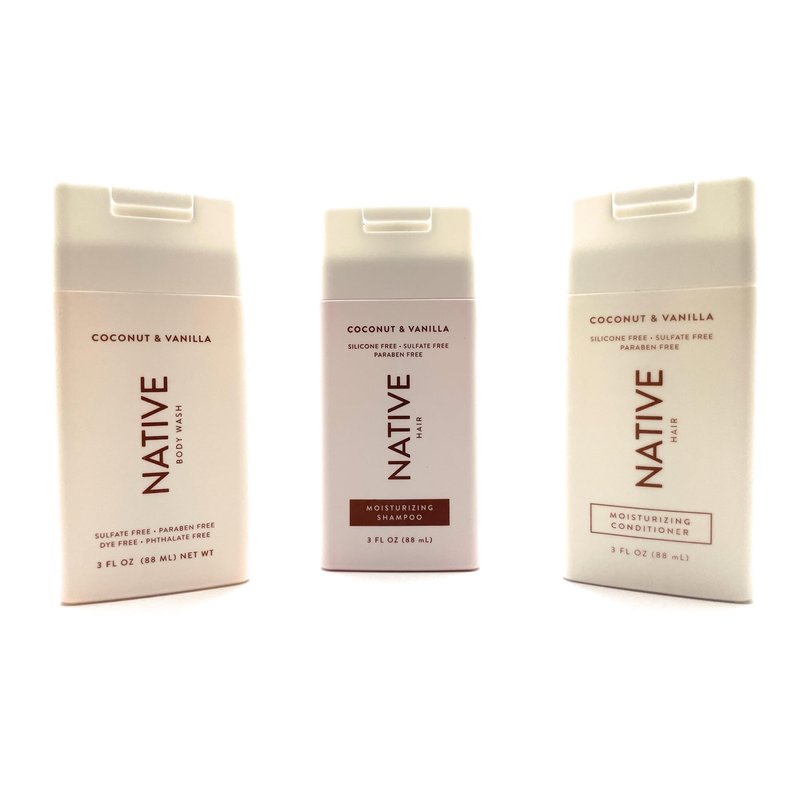 - Coconut & Vanilla Travel Size Native Collection Set Includes (1) Each : Moisturizing Shampoo (3 oz), Moisturizing Conditioner (3 oz) and Body Wash (3 oz).