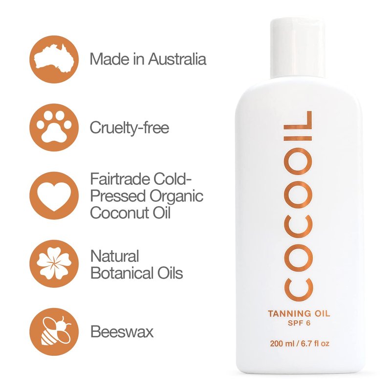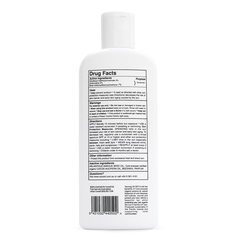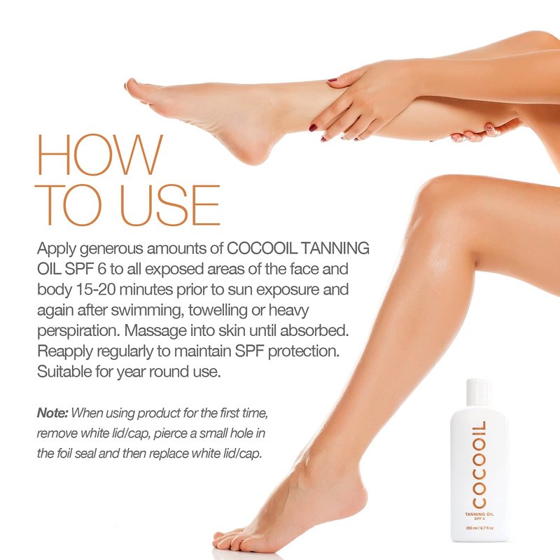 - HOW TO APPLY: Apply generous amounts of COCOOIL TANNING OIL SPF 6 to all exposed areas of the face and body 15-20 minutes prior to sun exposure and again after swimming, towelling or heavy perspiration. Reapply frequently. Note: When using product for the first time, remove white lid/cap, pierce a small hole in the foil seal and then replace white lid/cap.