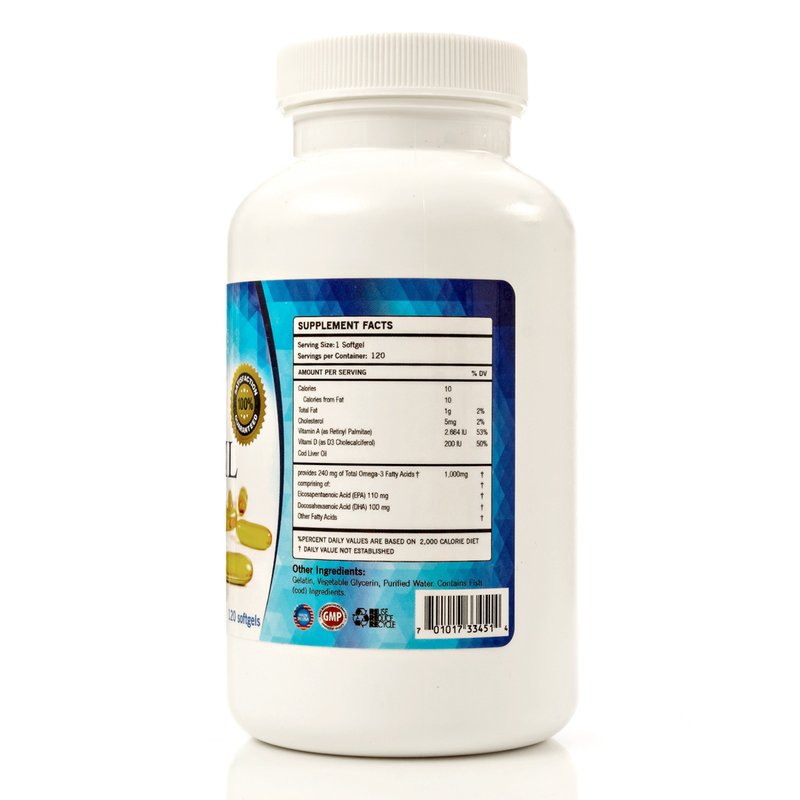 Cod Liver Oil Capsules - Premium Certified Pure and Fresh - Triple Strength - Heart Healthy - 120 Softgels - Natural Supplement - 240mg of Omega 3 Fatty Acids - No Fishy Taste!