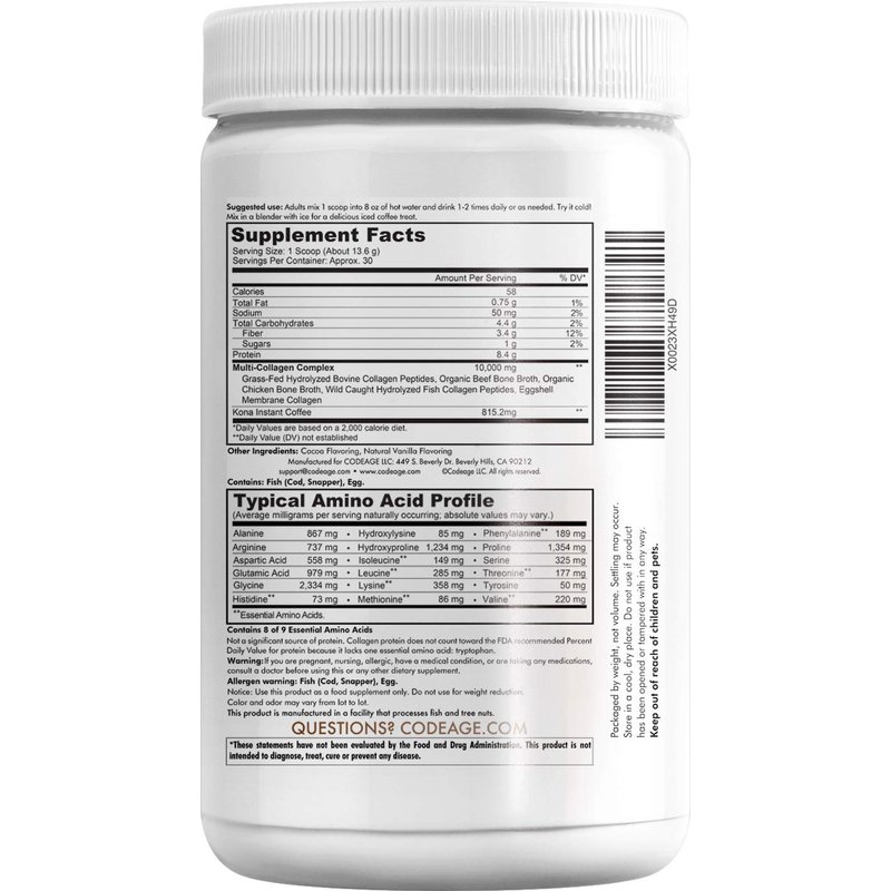 - High in collagen, low calorie - One serving of Codeage multi collagen protein powder coffee mocha mix provides 10g of collagen, 3.4g of fiber and only 1G of sugar and 58 calories!