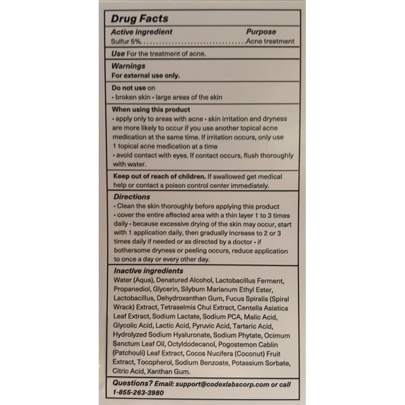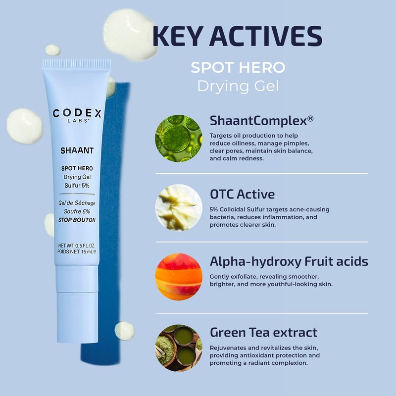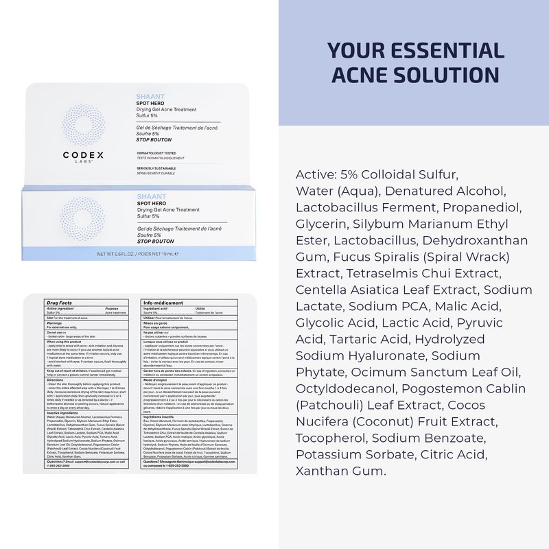 Codex Labs Shaant Spot Hero Acne Gel - Drying Gel - For Acne Prone Skin, Oily Skin, All Skin Types - With 5% Sulfur, Green Tea Extract - Cruelty-Free, Vegan Skincare (15ml)
