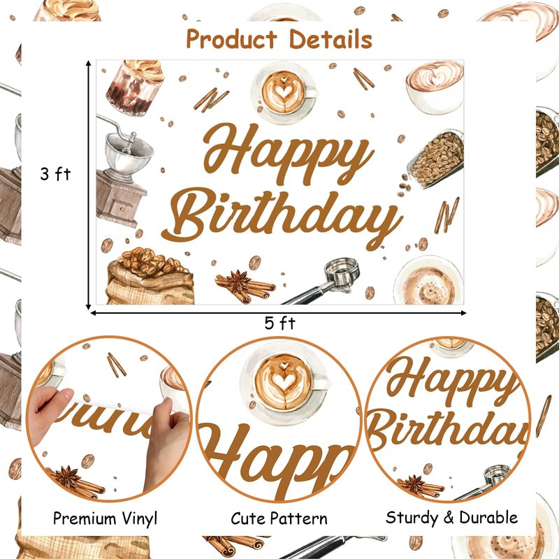 - Self-Designed Backdrop: The coffee “Happy Birthday” backdrop measures 3.28*4.92 ft, the patterns printed on the it like coffee cocoa bean and coffee cups are cute and delicate, which will make your party scene more eye-catching, and can definitely be a fabulous photography background to take photos.