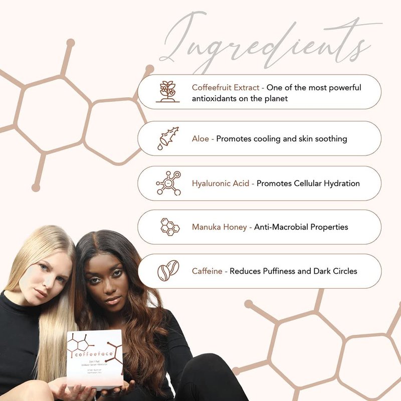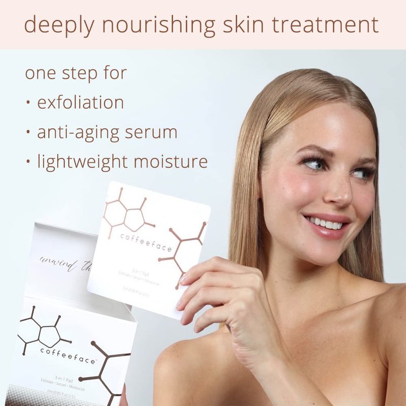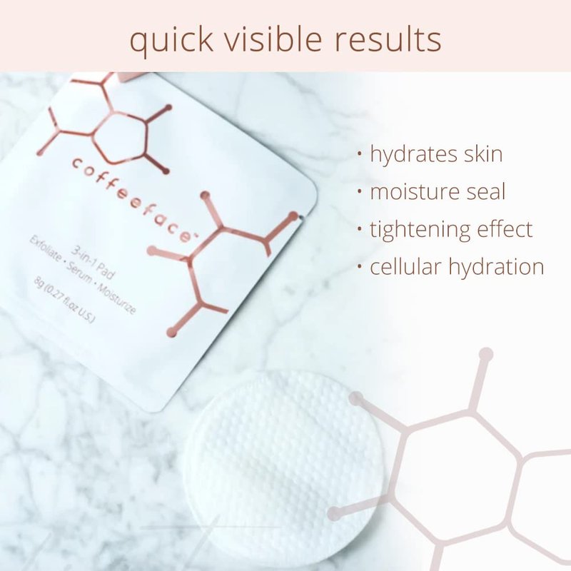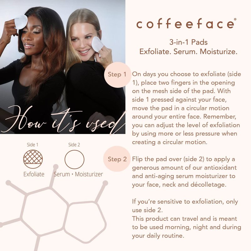 These innovative coffeeface moisture pads simplify your skincare routine—saving you multiple steps morning and night. They are packed with antioxidants and high performance anti-aging ingredients. One side of the pad offers a gentle textured exfoliation safe for daily use. After the dead skin cells are turned over, this allows our lightweight serum infused moisturizer to penetrate deeper. The results? Hydrated, plump, fresh skin. Each pad is housed in its own packet, soaked in our proprietary engineered formula. Perfectly portable and TSA-friendly.