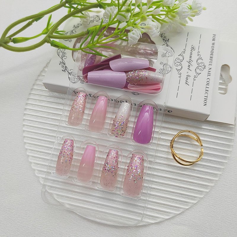 Coffin Press on Nails Medium False Nails with Glitter Designs Gradient Fake Nails Cute Nails Press ons Glossy Glue on Nails Purple Full Cover Acrylic Stick on Nails for Women 24Pcs