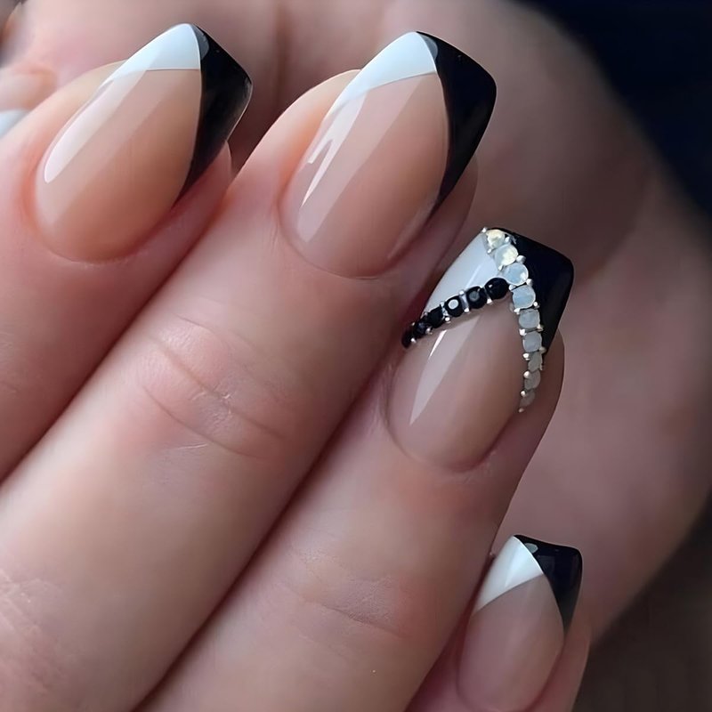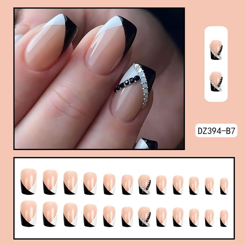 Coffin Press on Nails Short Square Fake Nails with Black&White French Tip Nails Designs Glossy False Nails with Glue on Nails Press Ons Artificial Nails for Women,24Pcs Short Square False Nail Tips
