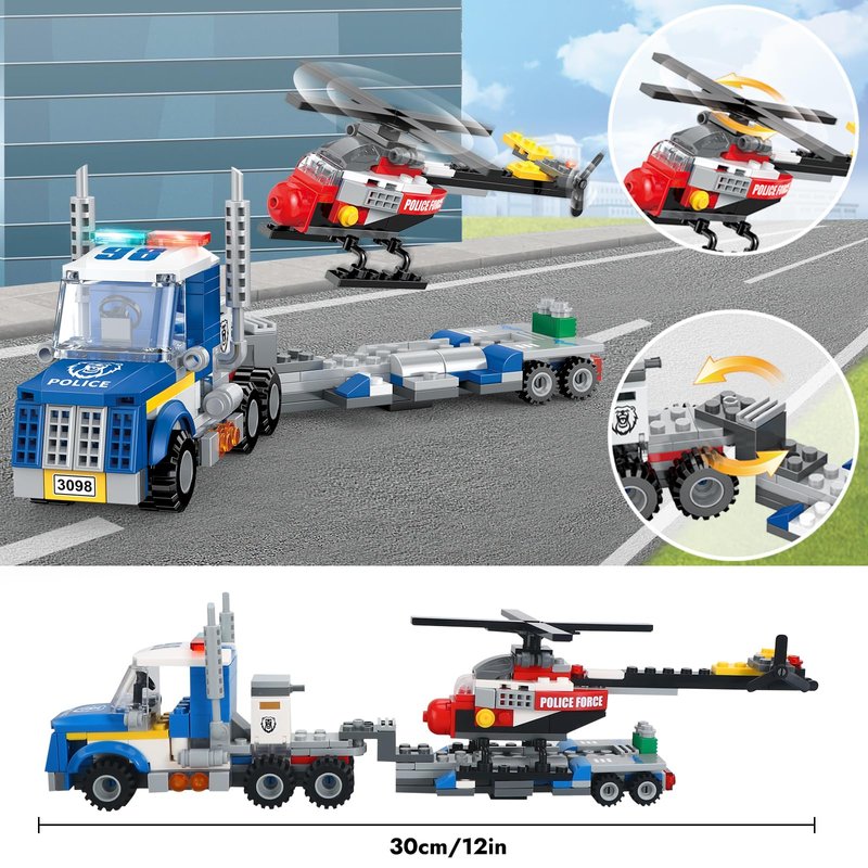 - ✨【3 in 1 Police Building Set】This city police set offers kids 3 build-and-play options for hours of police rescue action with different cool vehicles. Including a brick separator for disassemble and a detailed instruction. Kids can build a police helicopter transporter truck, then rebuild to create a car-chase scene about police chase thief, or transform into a police car carrier