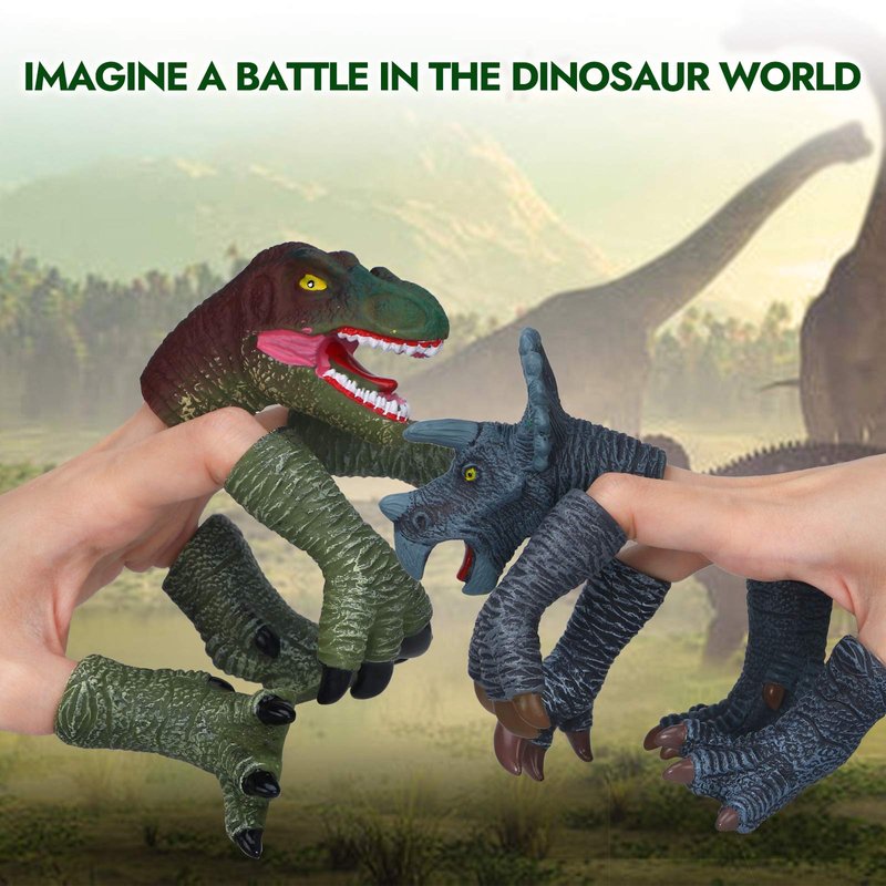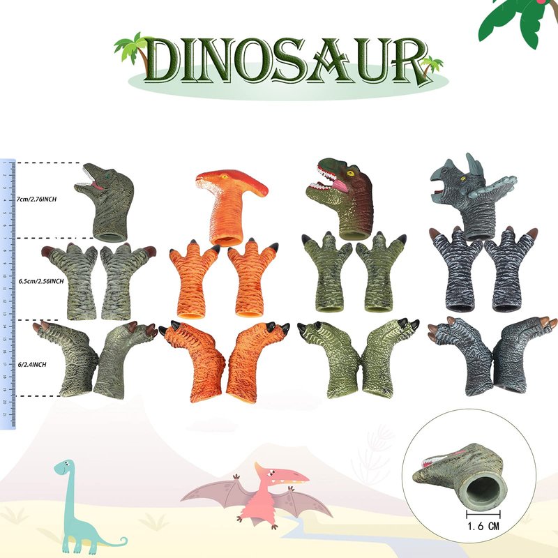 - 4 SETS OF DINOSAUR TOYS -A total of 20pcs dinosaur finger puppets, including 4 dinosaur heads (Tyrannosaurus rex, Triceratops, Velociraptor, Parasaurolophus), 8 dinosaur paws, and 8 feet.