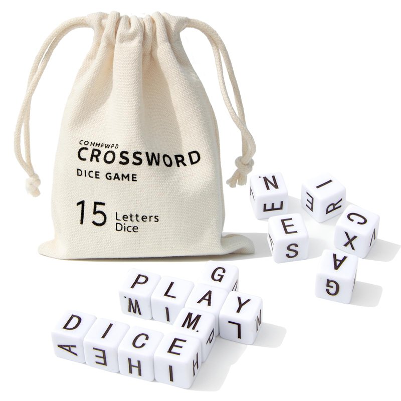 COHHFWPD Crossword Solitaire Dice Game, Dice Game with 15 Letters Dice, Funny Family Game for Christmas Night, Travel Game with in canvas bag Include: 15 letters dice of acrylic, 1 canvas bag and 1 product manual Canvas Bag Size: 3.93 x 5.11 inches Carton Size: 4.72 x 3.14 x 0.98 inches Product Weight: 0.24 Ib