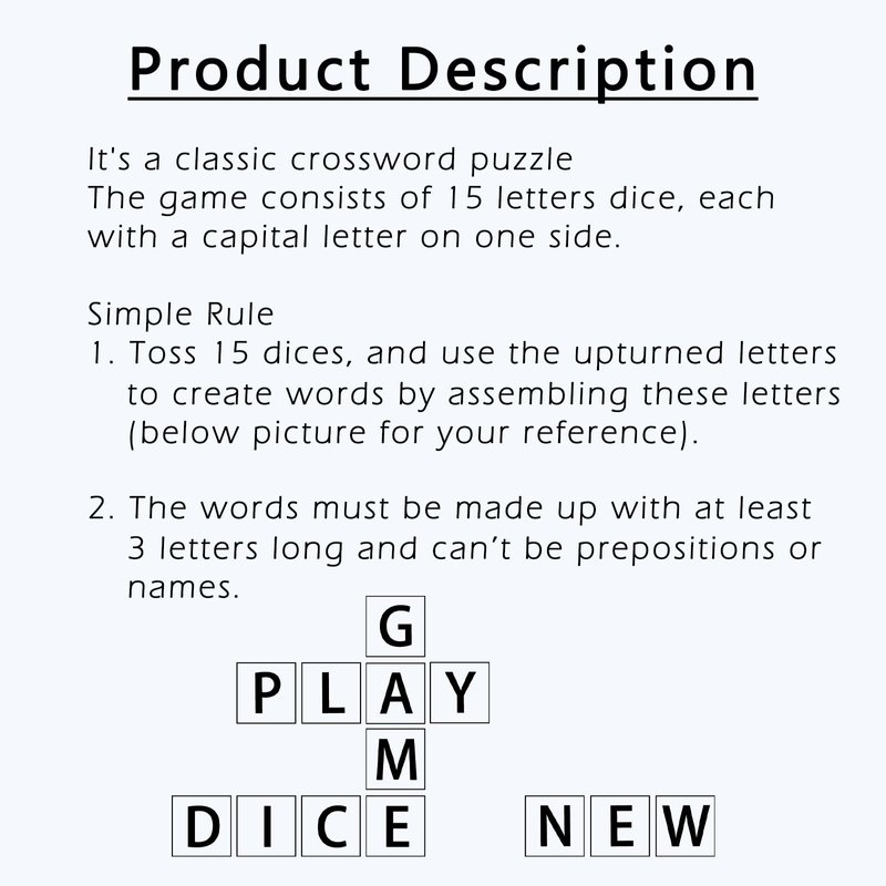 - Simple Design and Use: There are 15 dice, each side is engraved with letters. 15 dice are used to form coherent words
