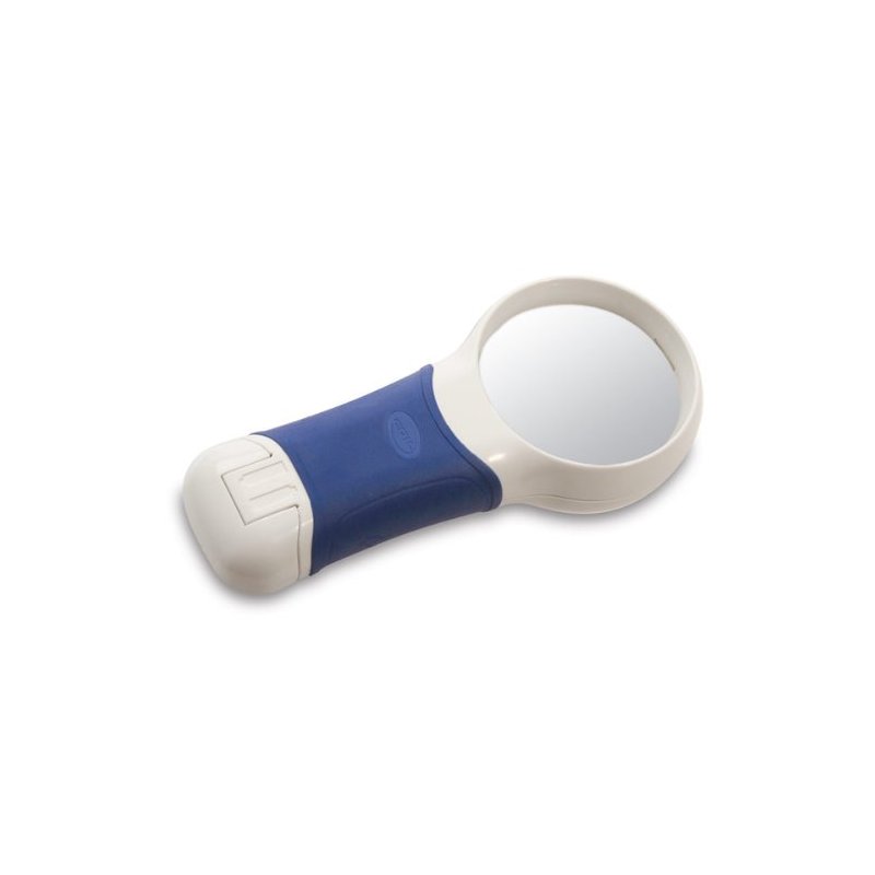 Coil AT-Max Auto Touch 7x LED Illuminated Magnifier- Round - The Coil AT-Max Auto Touch 7x, 24-diopter LED Illuminated Magnifier with its 2.27 (57.6mm) diameter round aspheric lens offers a large, low-distortion field of view and uniform LED light across the lens for an easier reading experience for those with low vision. Its ergonomic handle conforms to the natural shape of the hand, making it comfortable to use for longer periods and easier for the arthritic and those with limited dexterity to hold. The Coil AT-Max visual aid magnifier is extra lightweight and features an auto touch on/off switch for smooth and simple operation. Batteries are easy to access and change. Uses 2 AA batteries (not included.) Included soft cloth pouch protects magnifier while not in use. Color: Blue/White.