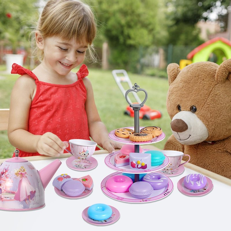- 【Learning Through Play】Tea set toy can stimulate your child's imagination, creativity and hand-eye coordination.The enough & variety cute desserts and tea toy will make children fall in love with role-playing and allow multiple children to play, develop their sharing habit and enjoy it.Perfect for kids aged 3-8, this tea-time toy encourages pretend play and socialization skills.