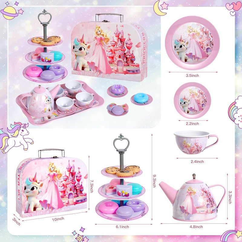 Coivnl Unicorn Tea Party Set for Little Girls Tin Teapot Set, Princess Tea Time Play Kitchen Toy Including Dessert,Cookies,Doughnut,Teapot Tray Cake,Case for Birthday Kids Age 3 4 5 6 7 8