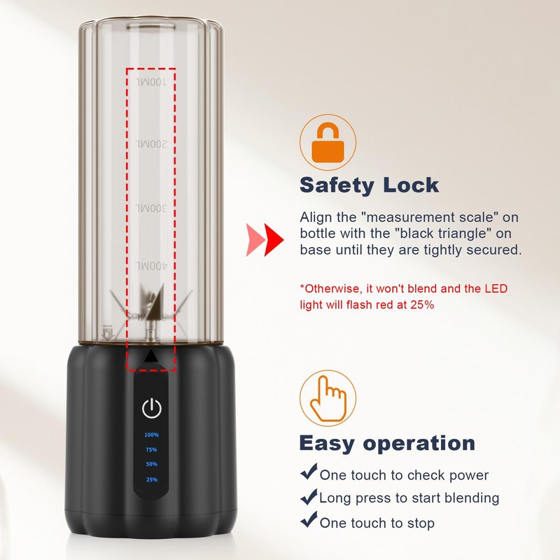 3.Safety Lock System: Our mini portable blender has a safety lock based on magnetic induction. Align the "Lock" and the "triangle" till the bottle and base are tightly secured. Otherwise it won't blends for safety.