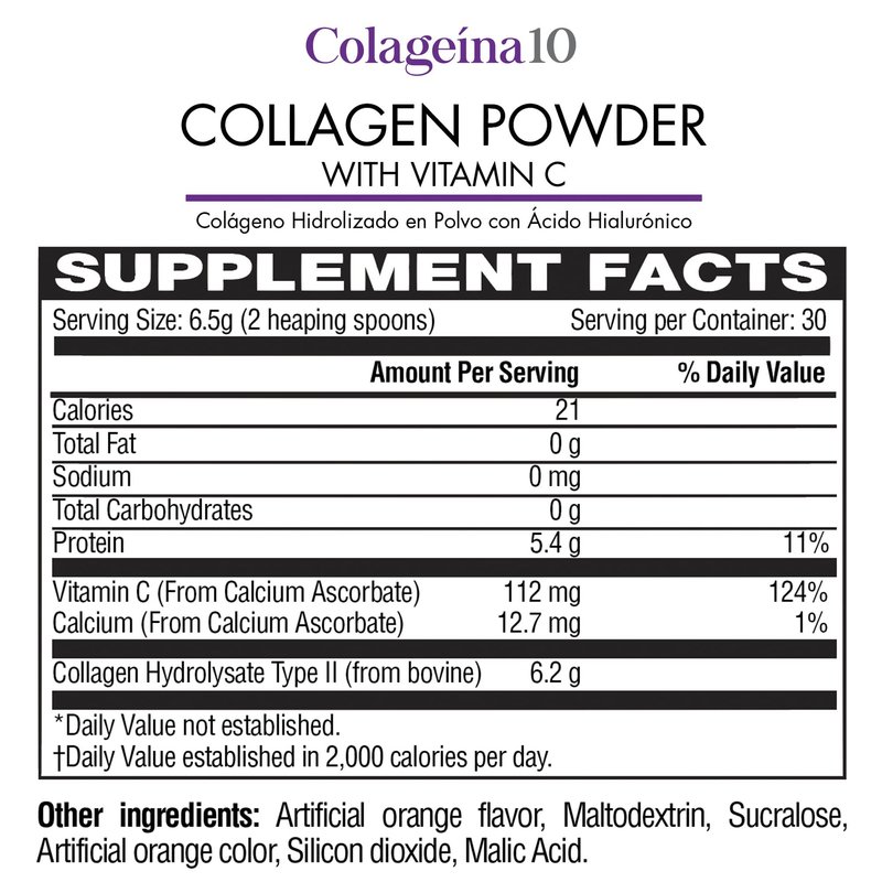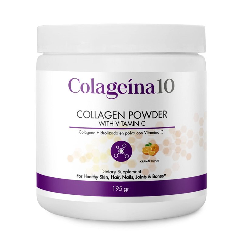 Colageina 10 Hydrolyzed Collagen Powder with Vitamin C - Anti-Aging Dietary Supplement for Healthy Skin, Hair, Nails, Joints, and Bones - 6.9 oz (195 gr)